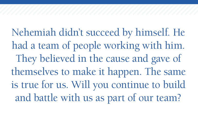 Nehemiah didn’t succeed by himself. He had a team of people working with him. They believed in the cause and gave of themselves to make it happen.