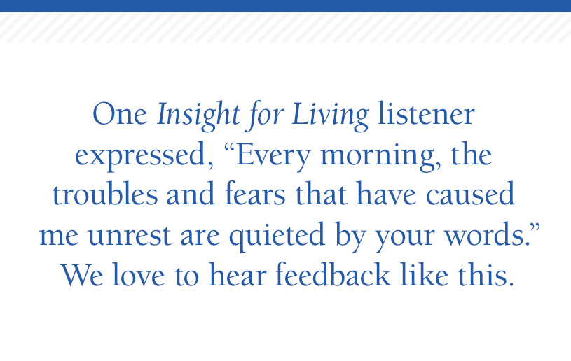 One Insight for Living listener expressed it this way, “Every morning, the troubles and fears that have caused me unrest are quieted by your words.” We love to hear feedback like this. It’s my privilege to share biblical truth and help people walk confidently and consistently in Christ.