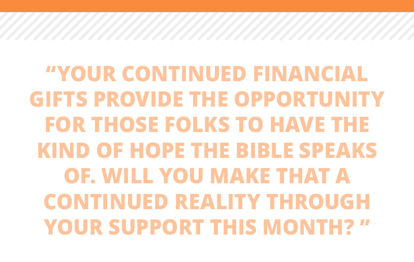 Your continued financial gifts provide the opportunity for those folks to have the kind of hope the Bible speaks of. Will you make that a continued reality through your support this month?