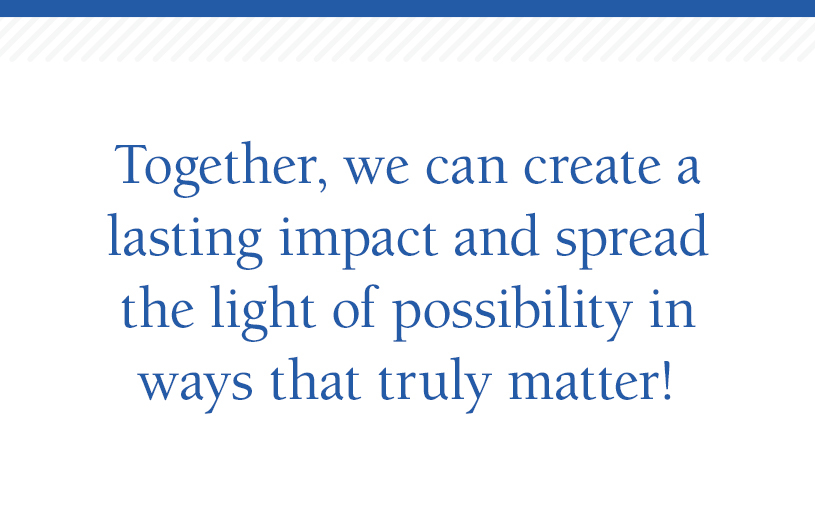 When you choose to give, you’re not just making a donation. You are making a powerful investment in a brighter future. You’re igniting a spirit of optimism that has the potential to change hearts and minds for the better. Thank you for helping us cultivate an environment where hope reigns and lives are transformed. Together, we can create a lasting impact and spread the light of possibility in ways that truly matter!
