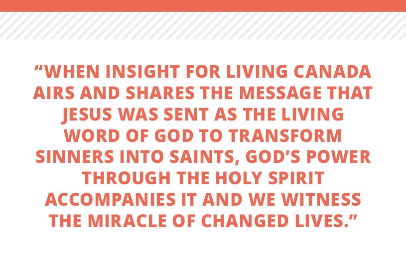 When Insight for Living Canada airs and shares the message that Jesus was sent as the living Word of God to transform sinners into saints, God’s power through the Holy Spirit accompanies it and we witness the miracle of changed lives. And this doesn’t just happen once, it happens abundantly and daily!
