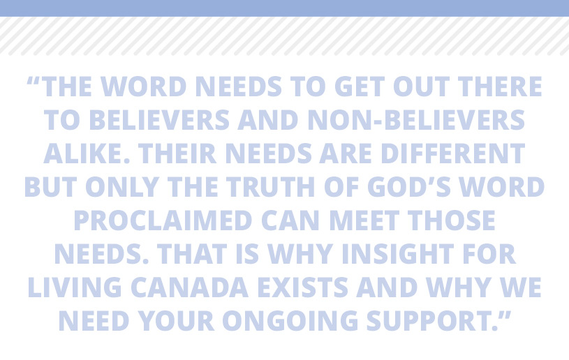 The Word needs to get out there to believers and non-believers alike. Their needs are different but only the truth of God’s Word proclaimed can meet those needs. That is why Insight for Living Canada exists and why we need your ongoing support.