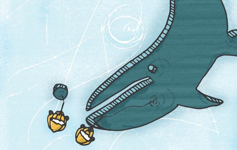 The man on the left has his line in the water too. He also waits calmly for a nibble. His hole, however, is more like a crater, a Rose Bowl-sized opening that reaches to the horizon—in the shape of a whale.